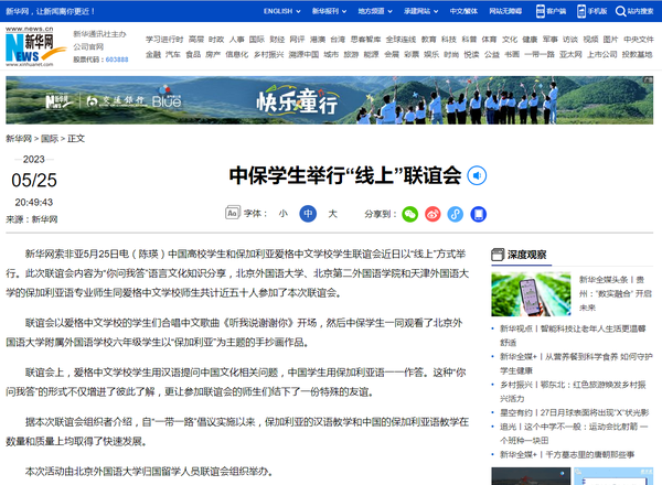 近日,我校保加利亚语专业师生受邀参加由北京外国语大学归国留学人员联谊会组织举办的中国高校师生和保加利亚爱格中文学校学生联谊活动。本次活动系中国高校保加利亚语专业师生与保加利亚中小学学习汉语的师生首次共同庆祝保加利亚教育、文化和斯拉夫文字节。活动通过“你问我答”中保双语分享语言文化知识的形式,增进了双方彼此了解,结下了一份深厚的友谊。新华网对此次活动进行了报道。中国的保加利亚教学与研究始于1961年,在长达半世纪的时间长河中,为中保友好交流打下了坚实的基础。自“一带一路”倡议提出以来,中保两国各领域交流合作成果丰硕,保加利亚的汉语教学和中国的保加利亚语教学取得了快速发展,这正是中国“合作共赢”理念的最好呈现。我校保加利亚语专业始建于2018年,是当前除北京外国语大学以外培养保加利亚语人才、推进中保交流的重要阵地,是中国仅有的3个保语教研单位之一。该专业与天津食品集团保加利亚公司建立长期合作关系,是欧洲语言文化学院首个建立就业实习基地的非通用语专业,目前,首届毕业生已实现100%充分就业,其中2人就职于天津农垦集团保加利亚公司,2人考取保加利亚索非亚大学、香港教育大学,1人考取公务员等。该