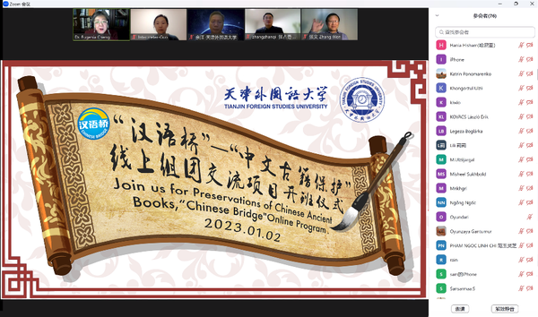 1月2日晚,由教育部中外语言交流合作中心主办,我校图书馆承办的汉语桥“中文古籍保护”线上团组交流项目举行开营仪式。本项目在我校国际合作与交流处的大力支持协助下如期上线,吸引了来自24个国家的150余名学员注册学习。副校长余江教授出席开营仪式并致欢迎辞。仪式由图书馆馆长程幼强教授主持,国际合作与交流处、图书馆相关负责人,部分项目学员和教师团队参加开营仪式。 余江代表学校对本次线上团组交流项目顺利开营表示祝贺。他指出,“中文古籍保护”项目为同学们了解中国语言文字和中文古籍提供了良好的学习机会。同学们可以通过直播和录播课程,在线学习汉语基础知识、古籍装帧、古法造纸、活字印刷、古籍传统修复技艺和数字化常识,通过传承千年的中文古籍,更多了解中国和中国文化。他希望同学们可以享受这次学习的旅程,为加强中西文化交流,推动构建人类命运共同体贡献力量。 程幼强邀请学员代表宝音(Batsuuri Buyanzaya)和萨义德(Mohammed Saddam Ahmed Saeed)发言,并同参与仪式的学员、嘉宾共同赏析经典中文歌曲《珊瑚颂》。 宝音分享了自己学习中文的收获、感受。萨义德表示