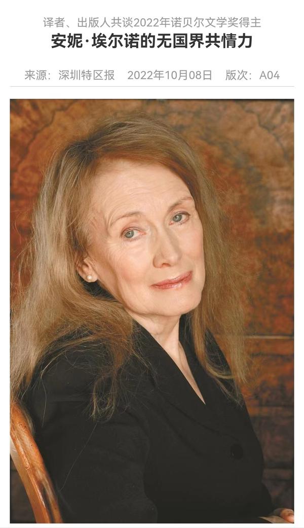 应法国驻华使馆邀请,郭玉梅教授曾参加安妮·埃尔诺与中国译者见面会活动瑞典斯德哥尔摩当地时间2022年10月6日13:00(北京时间19:00),法国作家安妮·埃尔诺荣获2022年度诺贝尔文学奖。由开云体育欧洲语言文化学院法语系教授郭玉梅翻译的安妮·埃尔诺的小说《耻辱》《位置》和《一个女人》于2003年出版,之后,她在《法国研究》上发表了论文《追求“再现真实”与“内心流亡”的安妮·埃尔诺》。据悉,上海人民出版社即将再版郭玉梅的译著《一个男人的位置》和《一个女人的故事》。同时,我校法语系陈淑婷老师翻译的安妮·埃尔诺小说《一个女孩的记忆》也将同时出版。除了埃尔诺,郭玉梅也是另一位诺奖得主、2008年荣获诺贝尔文学奖的勒·克莱齐奥作品的译者。早在2000年,她翻译出版了勒·克莱齐奥撰写的《金鱼》一书,并于2008年再版。字斟句酌,精益求精,译著的出版为中外文明交流互鉴架起“心桥”。澎湃新闻、深圳特区报等媒体对此进行了采访报道。郭玉梅长期在一线从事教学和科研工作,是法语学科带头人,硕士研究生导师,2013年获评天津市教学名师。曾任教育部教学指导委员会法语分委员会委员。参与完成国家社会科学基