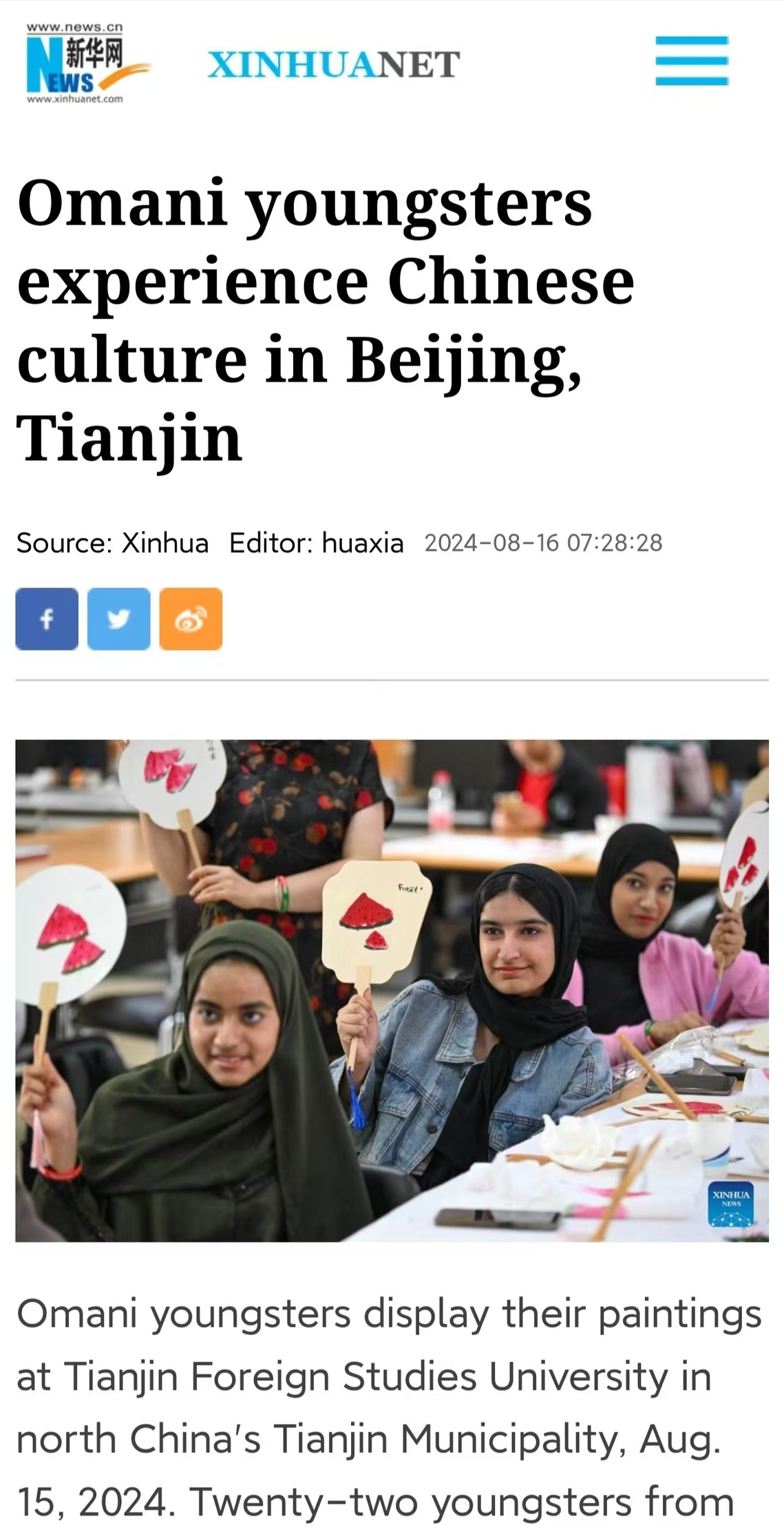 近日,由开云体育图书馆承接的教育部中外语言交流合作中心“津沽印象”——“汉语桥”阿曼青少年团组夏令营在天外开营。阿曼青少年团22名学员在为期两周的学习时间内,在北京、天津两地体验中国文化。本次活动受到了新华社等媒体的关注报道。全文转载如下: Omani youngsters experience Chinese culturein Beijing, Tianjin Omani youngsters display their paintings at Tianjin Foreign Studies University in north Chinas Tianjin Municipality, Aug. 15, 2024. Twenty-two youngsters from Oman are on a two-week study tour in Beijing and Tianjin to experience the Chinese culture. (Xinhua/Sun Fanyue)Omani youngsters visit Tianjin Planning Exh
