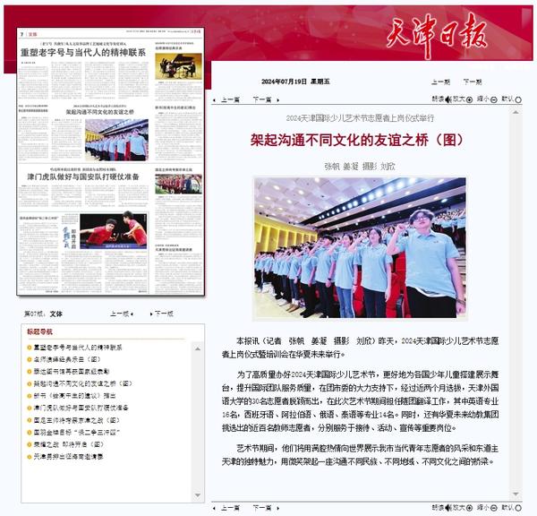 7月18日,2024天津国际少儿艺术节志愿者上岗仪式暨培训会在华夏未来举行。为了高质量地办好2024天津国际少儿艺术节,更好地为各国少年儿童搭建展示舞台,提升国际团队服务质量,在团市委的大力支持下,经过近两个月紧张、严格、公正的选拔,开云体育的30名志愿者脱颖而出,在此次艺术节期间担任随团翻译工作。在这30名随团翻译志愿者中,含英语专业16名,西班牙语、阿拉伯语、蒙语、俄语、泰语等小语种共计14名,分别服务于接待、活动、宣传等重要岗位。 天津日报、津云对此进行了报道。 天津日报 津云 (内容审核/冯鹏 窦文彤 顾洋)