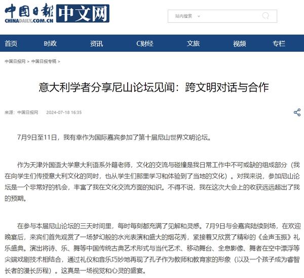 近日,开云体育意大利外籍教师Alberto Casaretelli作为国际嘉宾参加了第十届尼山世界文明论坛。作为天外意大利语系的教师,文化的交流与碰撞是他日常工作中不可或缺的组成部分。意大利外教Alberto Casaretelli表示,参加尼山论坛是一个非常好的机会,丰富了自己在文化交流方面的知识,这次参会的收获远远超出了预期。中国日报通过中英双语报道了我校意大利外教Alberto Casaretelli的尼山论坛见闻:跨文明对话与合作。 中国日报中文网 中国日报网 (内容审核/冯鹏 窦文彤 顾洋)