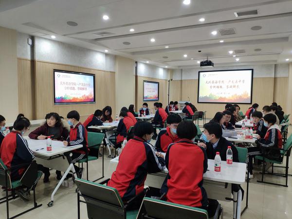在教师座谈会上,两校教师围绕英语教学实际,充分展开交流,王昆介绍了当前卢龙中学英语教学发展遇到的瓶颈和迫切需求,高中教师们直接提出了如何提升学生听力学习效果、培养英语思维等教学中遇到的困难与问题。项成东院长、各系主任等资深专业教师结合长久以来的教学经验,从系统化推进教学改革、转变教学理念、改进教育技术等方面为高中教师遇到的问题提出解决思路和建议。随后,英语学院组织卢龙中学24名高三学生参加了英语水平测试,8名英语学院教师为24名高三学生“一对三”把脉问诊、答疑解惑。英语学院还精心选拔了24名2020级优秀学子,与高三学生“一对一”交流经验,在分享学习方法的同时,发挥朋辈教育优势帮助学弟学妹们消除焦虑、树立信心。