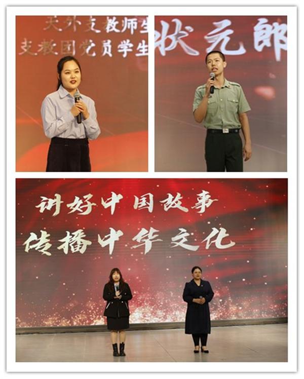 优秀学子事迹分享环节共分为三个篇章:在“初心------家国使命 勇毅担当”篇章中,天津市大学生年度人物获得者高岩,优秀退伍学子、新中国成立70周年庆祝大会亲历者吴浩楠,志愿翻译突击队成员、渤海道德奖学金获得者崔文颖,孔子学院志愿者、“汉语桥”项目学生助教张雨晴,讲述了弘强国志砥砺爱国行、怀沙场梦携笔赴疆场、以口为刀战“疫”逆行的家国情怀;在“奋斗------为党为国 无悔青春”篇章中,天津市大学生自强自立年度人物提名奖获得者姜涓,三井住友银行(中国)有限公司奖学金获得者陈晴,天津市创业奖学金获得者张馨戈,国家奖学金获得者、“知在天外 行在桃园”实践项目优秀个人陈心怡,展现了面对艰难信念坚不可摧、投身社会实践热心公益、专注创新创业无悔奋斗的青春热血;在“起航------砥砺前行 逐梦未来”篇章中,天津市应急外语服务“一基地三库”成员高铭铭,国家励志奖学金获得者、外交部定向培养人选王瑞,天津市“三八红旗手”标兵、 2009届校友高超,汇报了参与应急外语服务、立志投身外交事业、实干钻研逐梦起航的动人故事。每位宣讲的同学还特别推荐了一本党史书籍,并分享党的优良传统对自己成长成才的影响,引起在场观众的共鸣。