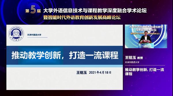 在清华大学110周年校庆之际,第五届大学外语信息技术与课程教学深度融合学术论坛暨智能时代外语教育创新发展高峰论坛于4月18日在清华大学以线上线下形式召开,云端参会人员达到1万6千余人。我校翻译与跨文化传播研究院院长王铭玉教授应邀出席,并以“推动教学创新,打造一流课程”为题作主旨发言,受到与会专家及其线上受众的好评。