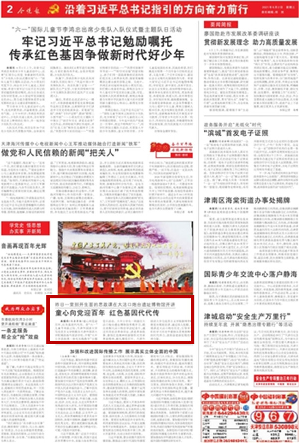 6月2日,《今晚报》2版以《昨日一堂别开生面的思政课在大沽口炮台遗址博物馆开讲 童心向党迎百年 红色基因代代传》为题目进行了报道。