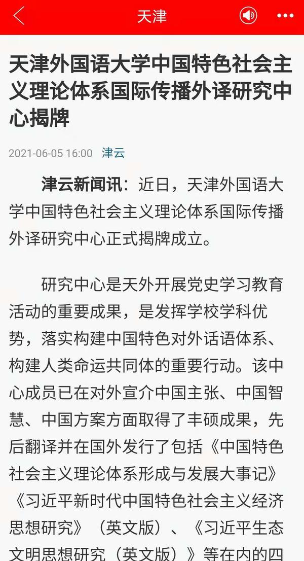 为贯彻落实习近平总书记关于“加强和改进国际传播工作,展示真实立体全面的中国”的重要讲话精神,我校成立中国特色社会主义理论体系国际传播外译研究中心并举行揭牌仪式。中国日报网、津云等媒体平台对此进行了报道。