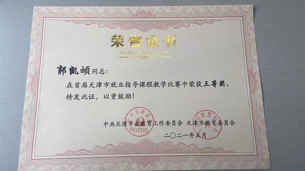 5月20日,由市教育两委主办,天津市大中专学校就业信息服务中心承办的天津市首届就业指导课程教学比赛在天津市大中专毕业生就业指导中心举办。我校国际商学院辅导员郭凯頔经前期选拔进入比赛,并荣获三等奖。