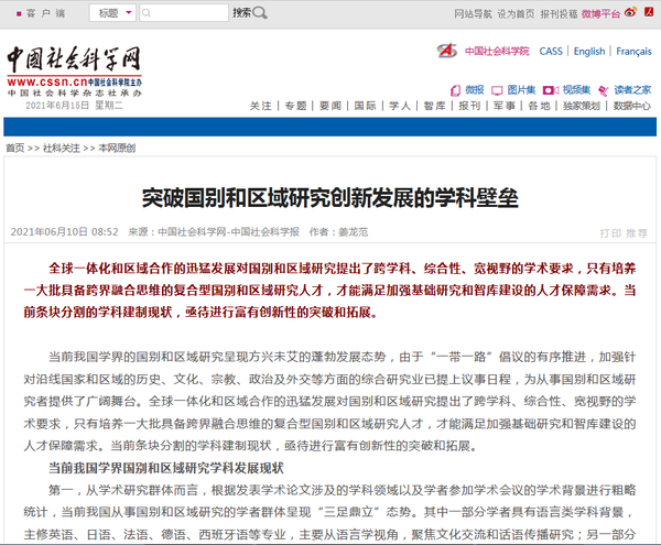 《突破国别和区域研究创新发展的学科壁垒》于2021年6月10日刊发于中国社会科学网-中国社会科学报,《中国社会科学报》,国内统一刊号:CN11-0274。