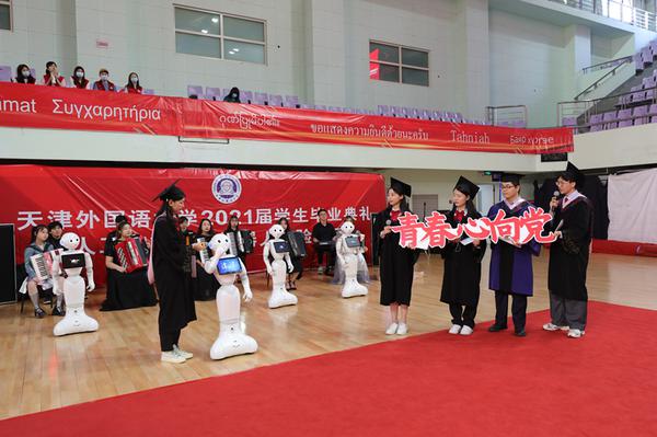 由人工智能音乐机器人乐团演奏的《智·未·来》拉开了毕业典礼的帷幕,科技与音乐的奇妙结合为典礼现场营造了和谐欢快的氛围。体育馆里,33种外文书写的毕业祝福标语环绕四周,一面面手持的国旗和党旗迎风招展,看台上毕业生拼出“TF?SU”惊艳亮相。现场播放了各学院精心制作的视频《青春无悔 不负韶华》、毕业视频《我心依旧 初心依然》,学子们看后流下了激动的泪水。