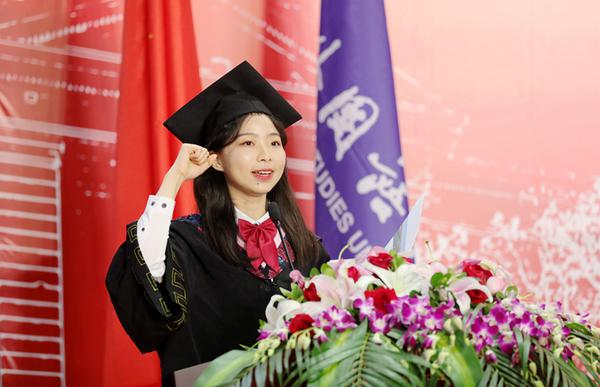 欧洲语言文化学院王佳鑫代表全体在校生发言,国际关系学院本科生王昕宇、国际教育学院硕士留学生达利娅、英语学院博士生刘璇代表2021届全体毕业生发言。82届优秀校友、瑞尔集团创始人兼总裁邹其芳,我校“我的良师益友”获得者、“英七七校友校长特奖”优秀教师、求索荣誉学院常子霞分别致辞。毕业生代表用诗朗诵《青春心向党》为母校和党献上最真挚的祝福。