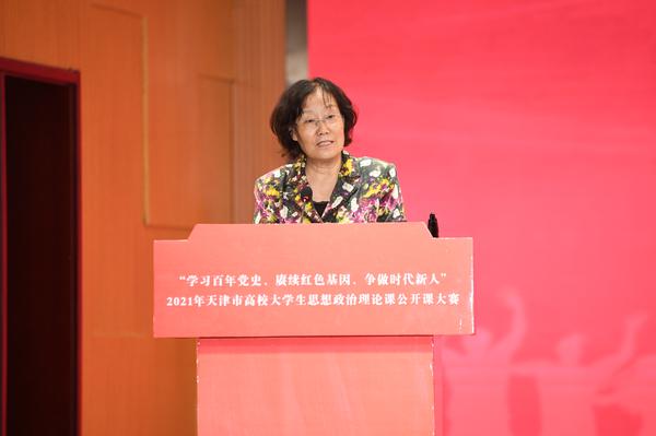 为深入贯彻落实习近平总书记在党史学习教育动员大会重要讲话精神,大力发扬红色传统、传承红色基因,激发青年学生对中国共产党百年辉煌的思想认同、政治认同、情感认同,6月20日,由市委教育工委、市教委主办的“学习百年党史、赓续红色基因、争做时代新人”2021年天津市高校大学生思想政治理论课公开课大赛(普通高校组)决赛在我校大学生活动中心成功举办。校党委副书记胡志刚、市委教育工委学生思想教育与管理处二级调研员赵蓓出席,本市15所高校思政课专家、学生参赛团队、师生代表120余人参加活动。经过激烈角逐,我校郭力娇学生团队和天津师范大学王林玉学生团队最终斩获一等奖。