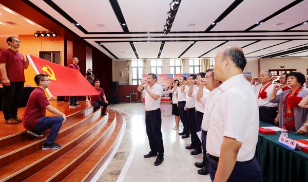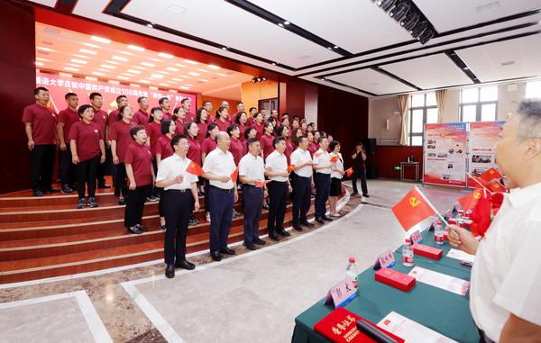 殷奇带领在场全体共产党员面向党旗重温入党誓词。在《没有共产党就没有新中国》的音乐声中,全场党员干部师生挥舞着手中的党旗放声高歌,唱出了永远跟党走的信心决心,表达了对党的百年华诞的真挚祝福,展现了天外人启航新征程的昂扬斗志。