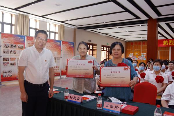 校党委书记殷奇为“光荣在党50年”老党员代表佩戴纪念章