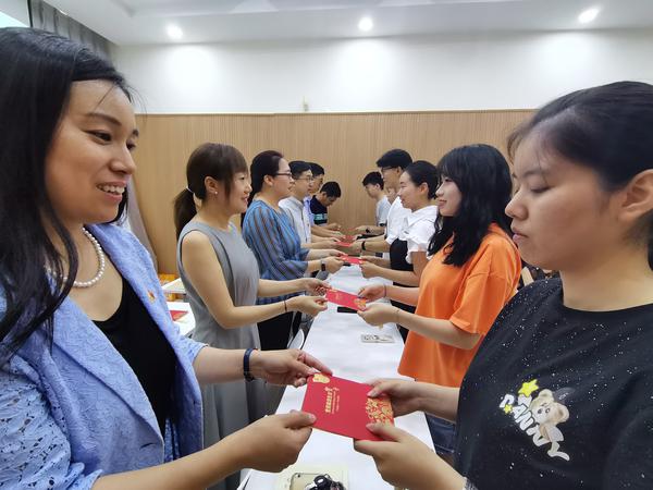 学院领导班子成员为党员代表发放政治生日贺卡并佩戴党徽