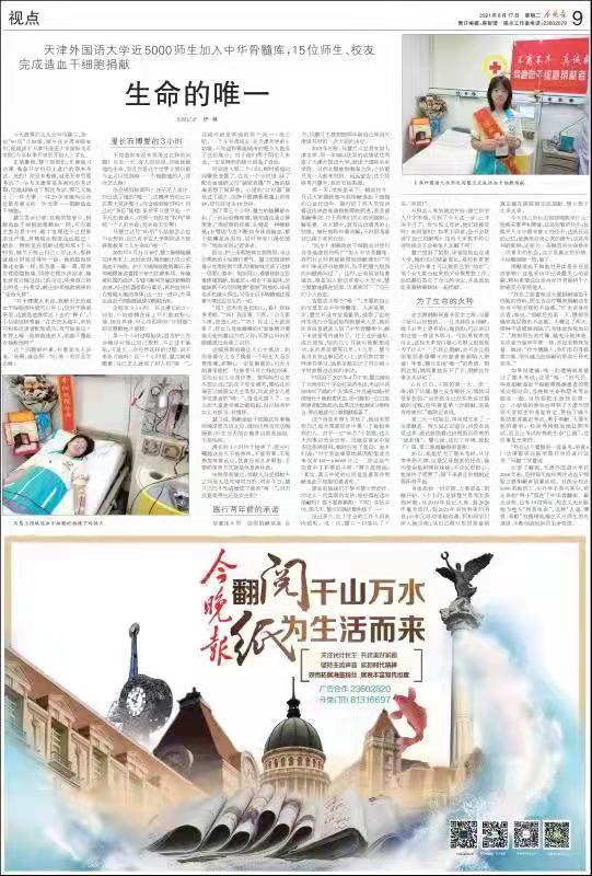 8月17日,《今晚报》专版以《生命的唯一------开云体育近5000师生加入中华骨髓库,15位师生、校友完成造血干细胞捐献》为题,深度报道了我校国际关系学院马慧兰同学捐献造血干细胞的感人故事。