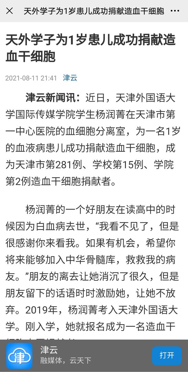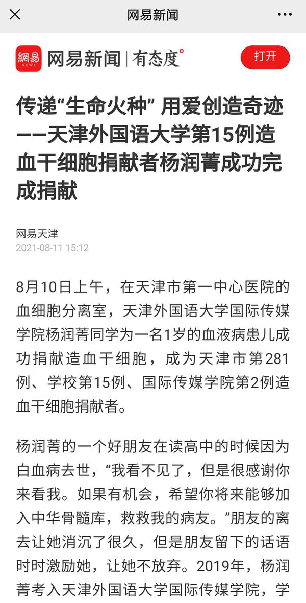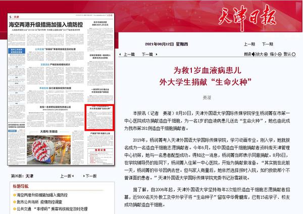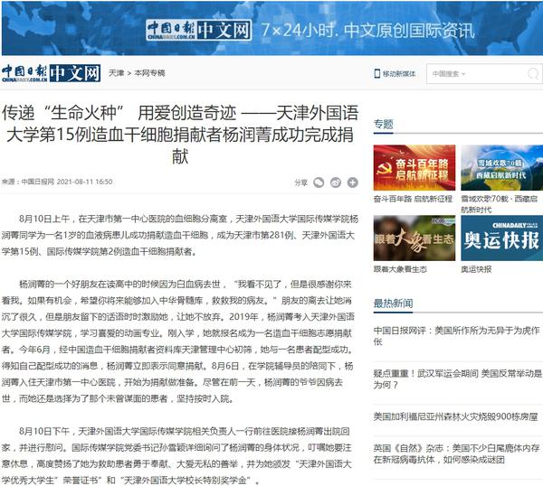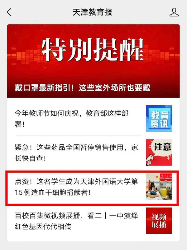 这是一场爱的接力,是一份温暖的传承,陆续还有越来越多的天外师生成为造血干细胞志愿捐献者,将生命“种子”留在中华骨髓库。《天津日报》《今晚报》《天津教育报》、中国日报网、津云、网易新闻等多家媒体对此进行了报道。