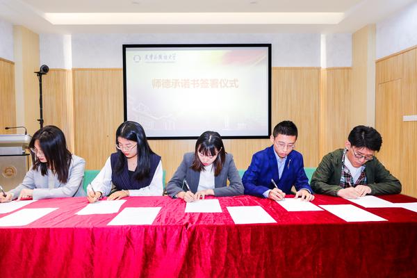 全体新教工郑重签署了《天津市高校教师师德承诺书》,承诺书从坚定政治方向、自觉爱国守法等十个方面约束和规范教师的言行,使新教工明确新时代教师职业规范,不忘立德树人初心,牢记为党育人、为国育才使命,认真履职尽责,努力做一名“四有”好老师。