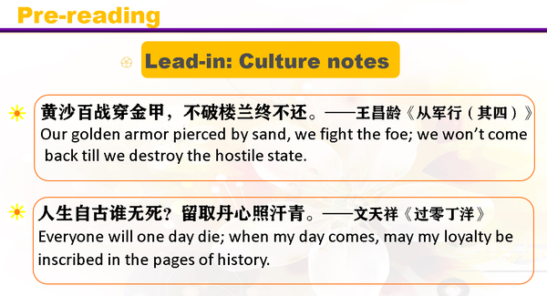 以王昌龄《从军行(其四)》及文天祥《过零丁洋》中的经典诗句鼓励学生探讨英雄具备的品质和英雄的信念与追求。