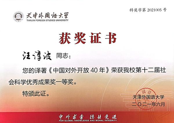 译著名称《40 Years of China's Opening-up》(ISBN:978-981-4866-85-9),原著名称:《中国对外开放40年》,原著作者:国家发展和改革委员会国际合作中心对外开放课题组;译著字数:35万字,人民出版社、圣智集团盖尔公司2020年6月出版。