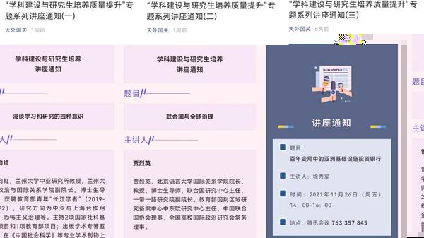 合力抓实培养质量,提振学院学术氛围。依托研究生院“学科建设与研究生培养质量提升”和科研处“求索高端论坛”,学院先后邀请“长江学者”、各兄弟院校专家围绕学习与研究、国际形势、全球治理等主题开展学术讲座8场,共同进行学术交流与分享,进一步拓宽专业学习渠道,营造良好学习氛围,不断为师生开展科学研究提供服务。