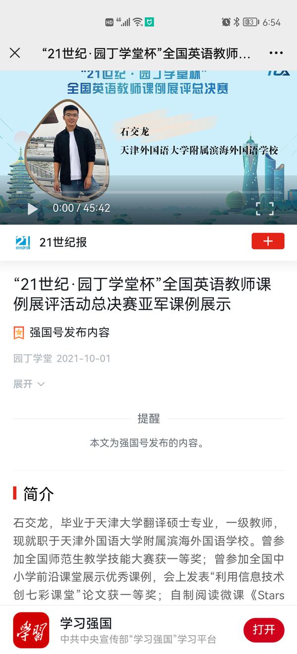 滨海小外高中部教师石交龙录制的英语思政课荣获“21世纪-园丁学堂杯全国英语教师课例展评”全国亚军
