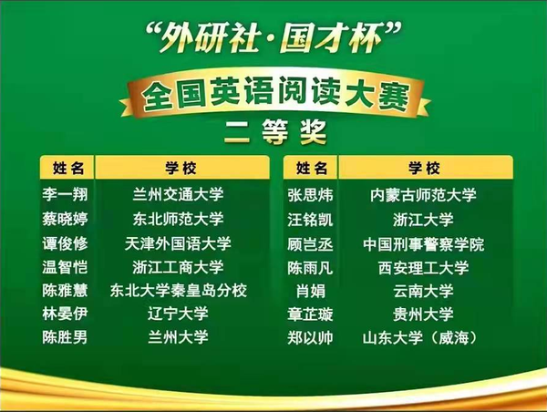 12月10日,“外研社·国才杯”英语阅读大赛全国总决赛结果正式揭晓,我校英语学院2018级谭俊修同学获得总决赛二等奖。