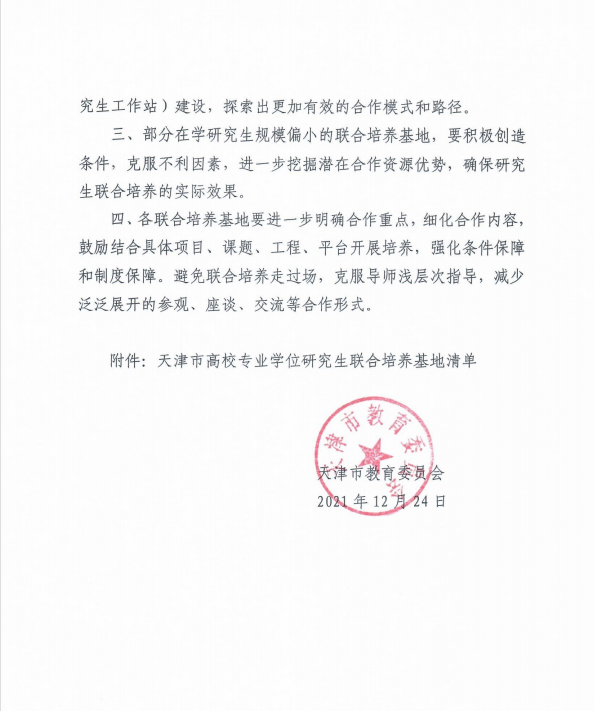 经市教委专家评审组审议,我校6个天津市首批专业学位研究生联合培养基地全部通过验收,其中我校与中共中央党史和文献研究院联合申报基地建设成效显著,获批“天津市高校专业学位示范联合培养基地”。