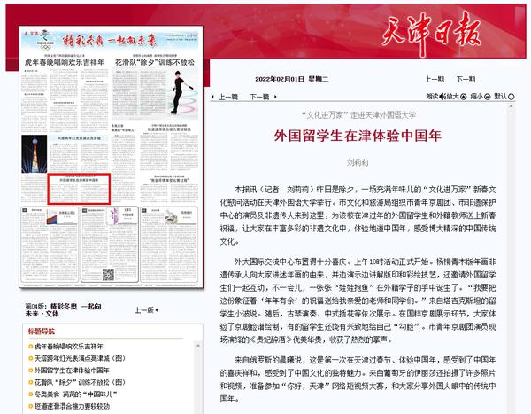 2月1日,《天津日报》第四版《“文化进万家”走进开云体育 外国留学生在津体验中国年》一文,报道了我校特殊的新年联欢会。