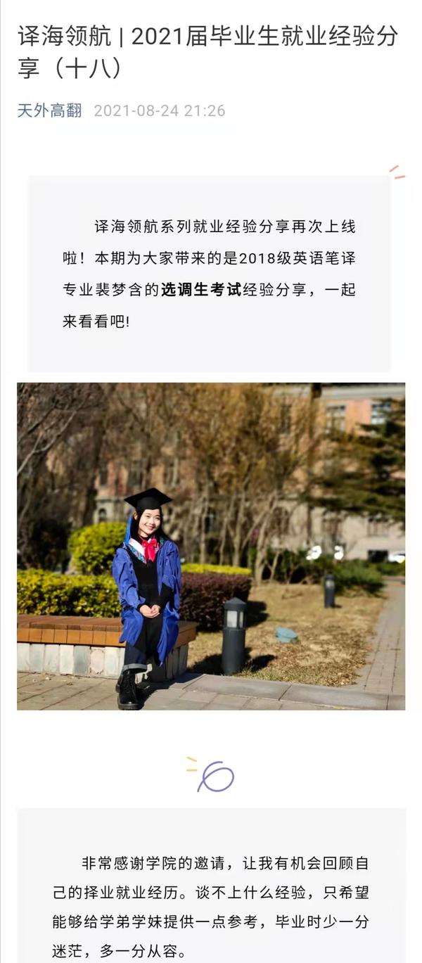 学院深谋校企合作,建立天津市外事办公室国研中心、新华社日本专线等实践基地,拓宽中央编译局、人民网、武警指挥学院、首都机场等合作,提供就业实习岗位22个,毕业生签约大众、华为、百度、科大讯飞、大金氟化工等校友企业占比达9.7%。同时,深耕招聘渠道,举办线上线下专场招聘9场,提供岗位70余个,举办用人单位宣讲会、毕业生推介会、实习对接会,提供远程面试、网上签约等全流程服务,构建“点对点”就业服务矩阵,分层次、分类型建立学生群组,精准推送就业信息862条,提供岗位2000余个。