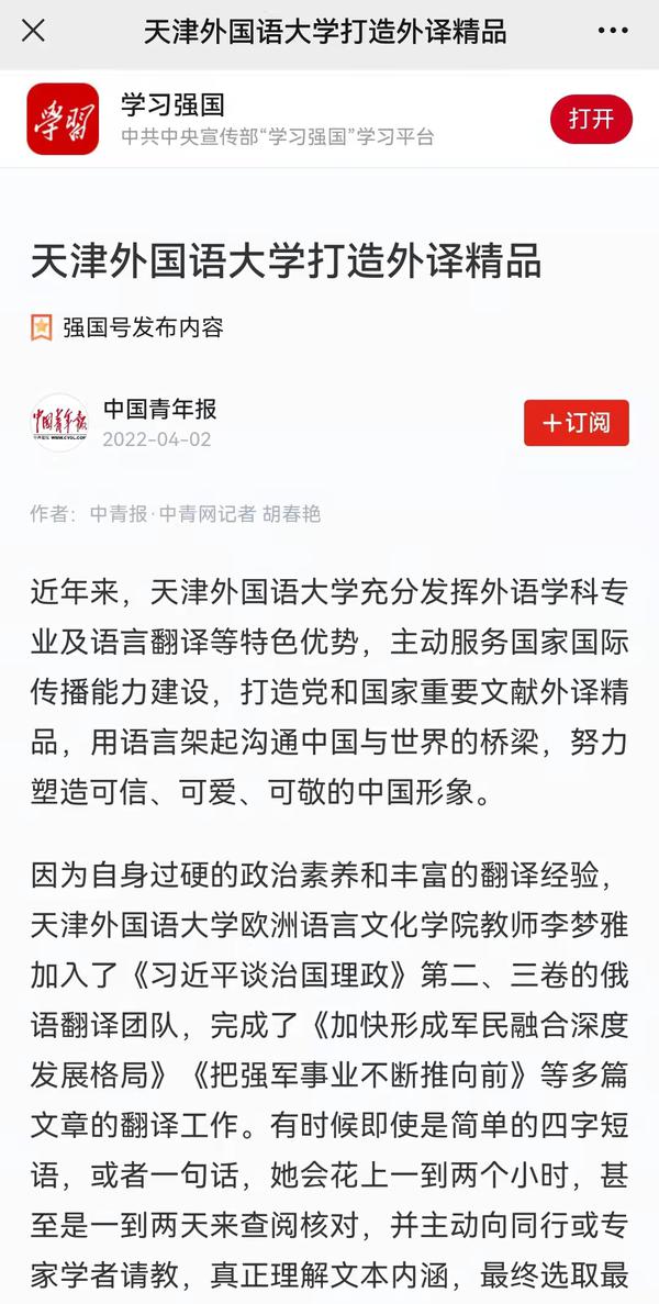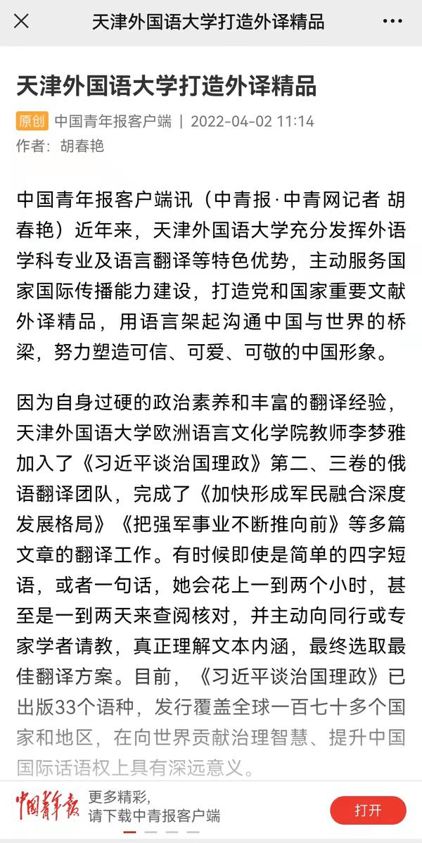 4月2日,中国青年报客户端、学习强国以《开云体育打造外译精品》为题,聚焦学校充分发挥外语学科专业及语言翻译等特色优势,用语言架起沟通中国与世界的桥梁,生动展示了天外师生精“译”求精,依托“中央文献翻译研究基地”“中国特色社会主义理论体系研究中心”两大平台,先后参与和承担完成39部理论阐释和中央文献对外翻译任务,为提升新时代党的创新理论的国际影响力和辐射力、加强国际传播能力建设贡献了智慧和力量。