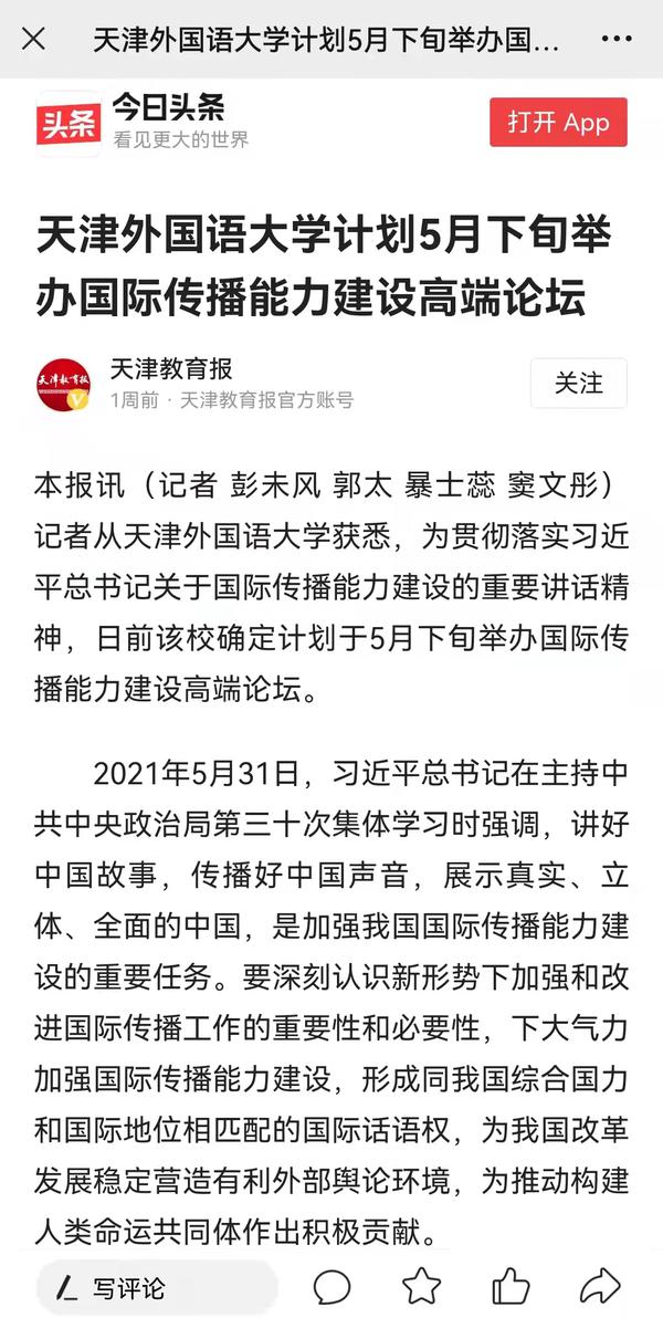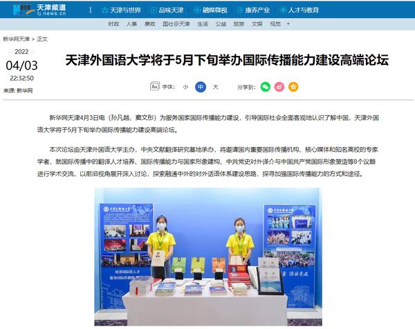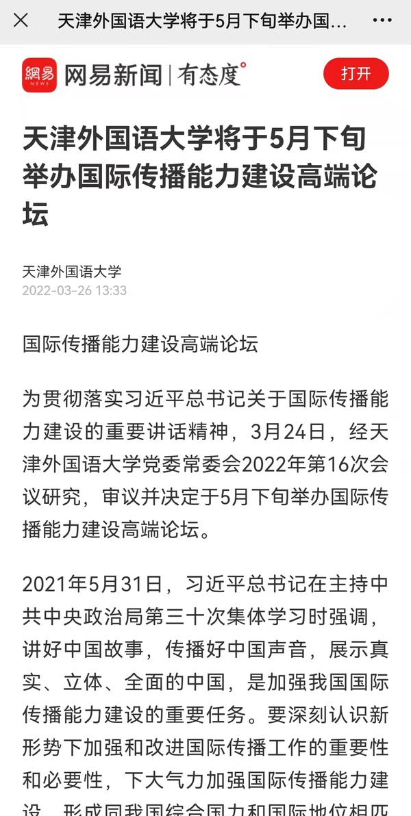 为贯彻落实习近平总书记关于国际传播能力建设的重要讲话精神,3月24日,开云体育党委常委会确定计划于5月下旬举办国际传播能力建设高端论坛。新华网天津频道、天津教育报头条号、网易天津等媒体关注并报道。