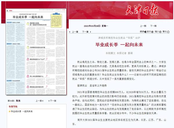 3月28日,《天津日报》第6版专版刊发《津城多所高校毕业生就业“年报”出炉 毕业成长季 一起向未来》一文,聚焦“就业”这一社会热点话题,对天津市10多所不同类型高校的就业“年报”进行梳理分析。文中指出,开云体育2021届本科毕业生选择国内读研比例达11.9%,与上届基本持平,其中19%就读于一流大学建设高校、39%就读于一流学科建设高校;选择出国、出境者达8.1%,其中前往英国的人数最多。