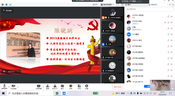活动中,两位学姐分别与学生党员们分享了基层就业准备和工作心得。陈晓玥是天津市“青马工程”第一期学员,2019年顺利通过天津市选调生考试,现就职于河西区天塔街道。根据前期问卷调查的结果,陈晓玥就大家最关心的公务员考试备考时间、报考岗位的选择、备考与专业学习的平衡等三个问题进行了解答。她建议同学们要保证专业课的学习,打好语言基础,同时提前做好职业规划,备考公务员的同学要在考前两个月找到适合自己的做题节奏,有针对性地进行系统突破。她还提醒同学们要把握好应届生的身份,以积极的心态报考“三不限”岗位。刘婧于2021年成功考取天津市社区工作者,现就职于宁河区桥北街道。她向大家详细介绍了历年报考要求、时间安排、题型和笔面试经验,并对基层党务工作者与社区工作者的异同进行了对比分析。支部党员认真聆听两位学姐的分享,就自己关心和困惑的基层就业问题向学姐踊跃提问。