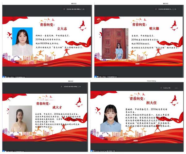 围绕习近平总书记对广大青年提出的“立大志、明大德、成大才、担大任”的期望,四位在青春赛道上奋力奔跑的“追梦人”分享了自己的故事。他们中有把握人生方向,立志毕业后投身新疆基层建设的“青马人”;有在今年1月份天津疫情形势严峻时协助社区完成多轮大筛任务,在默默奉献中擦亮青春底色的“志愿者”;有练就过硬本领,考取中国政法大学国际商务专业硕士研究生的“外语+”复合型人才;还有肩负历史使命,在2020年疫情暴发后第一时间投入天外志愿翻译突击队的“译行者”。非通用语学生党支部“寻找海外的马克思”实践团成员也通过视频的形式与大家分享了在海外留学期间,讲好中国故事、传播好中国声音、成为中外文化交流使者的故事。支部党员用八个外语语种畅谈青春,实现中国情怀的世界表达,感受奋进中国的青春力量。
