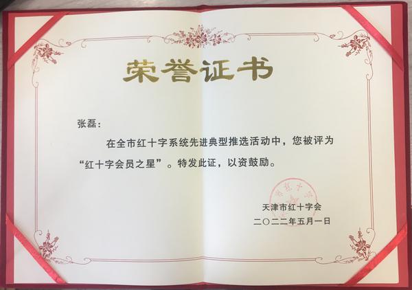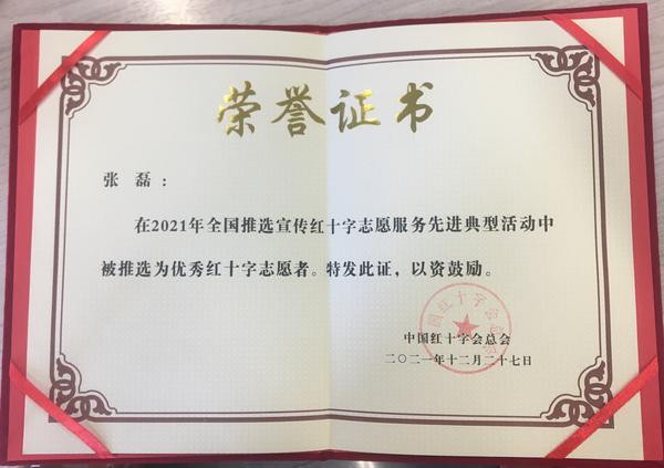 为深入学习贯彻习近平新时代中国特色社会主义思想,认真贯彻落实习近平总书记关于红十字事业的重要指示精神,进一步推动红十字会员管理水平提升及志愿服务工作制度化、规范化,中国红十字会总会、天津市红十字会开展了推选宣传红十字志愿服务先进典型活动,我校学生处张磊老师被评为全国优秀红十字志愿者、天津市红十字系统“红十字会员之星”。