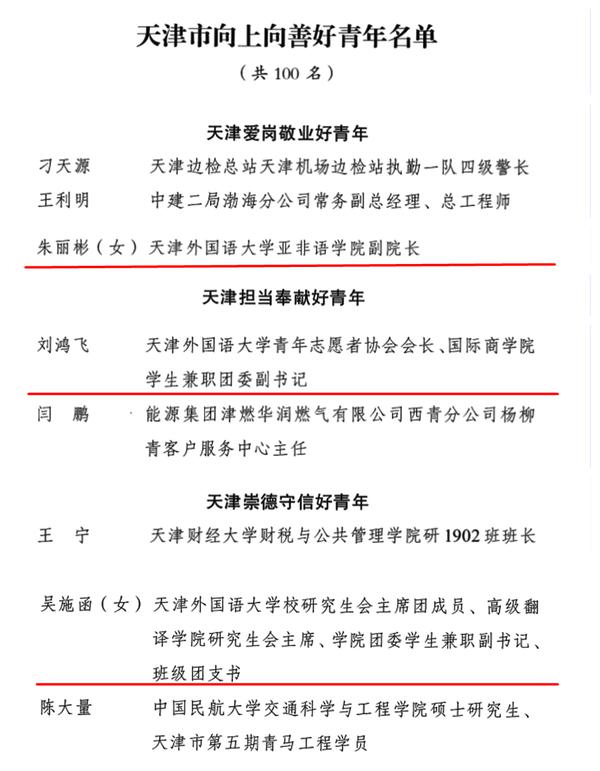2022年,为深入学习贯彻习近平新时代中国特色社会主义思想,团市委在全市范围内开展“天津市向上向善好青年”评选活动,经过层层评选,我校亚非语学院副院长朱丽彬获“天津市向上向善好青年”之“爱岗敬业好青年”,国际商学院学生刘鸿飞获“天津市向上向善好青年”之“担当奉献好青年”,高级翻译学院学生吴施函获“天津市向上向善好青年”之“崇德守信好青年”。