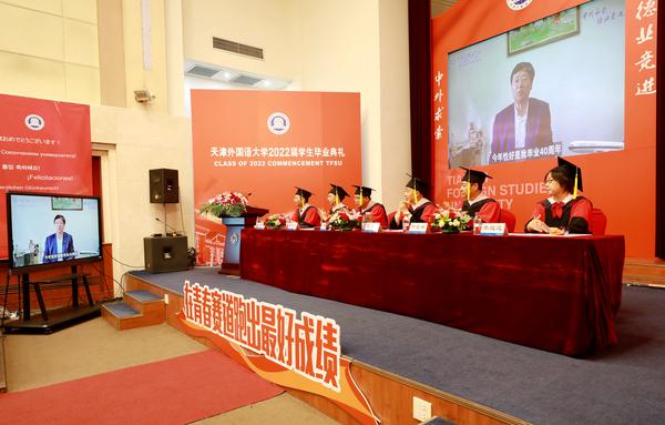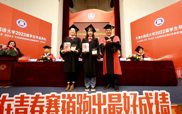 报告厅内,33种外文书写的毕业祝福语环绕四周,“中外求索 德业竞进”的校训尤为醒目。现场播放了各学院精心制作的视频《忆.别》、毕业视频《烁》,学子们共同重温美好难忘的天外时光,流下了激动的泪水。