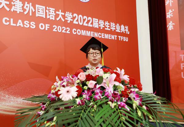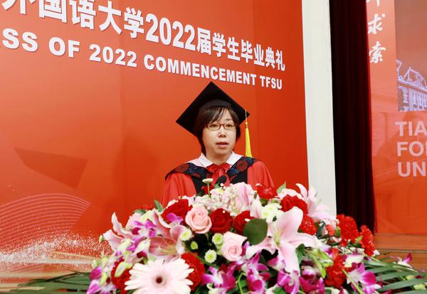 国际商学院陈佳玉代表全体在校生发言,欧洲语言文化学院本科生李鑫颍、国际教育学院留学生伊莉莎代表2022届全体毕业生发言,句句真心,字字动情。教师代表英语学院周薇老师语重心长的嘱托,更是饱含深情、触动人心,毕业生纷纷潸然泪下。我校法语专业82届校友、法国校友会会长、法国PLD国际物流公司总经理、中国驻法大使馆抗击新冠肺炎疫情“贡献奖”获得者张国强学长的寄语激发起毕业生奋斗的动力。