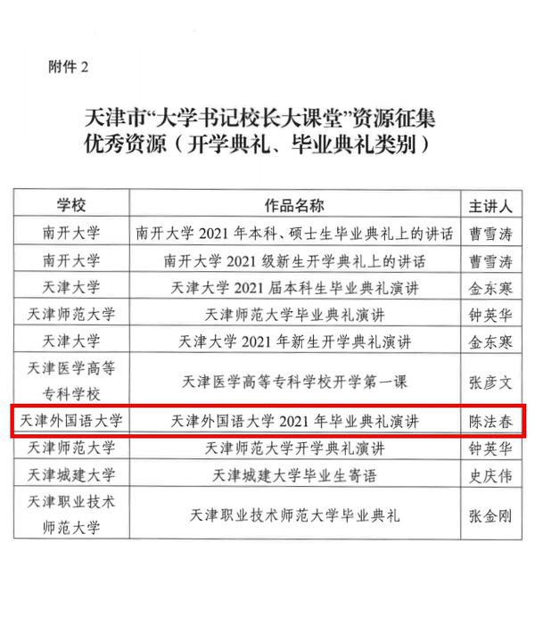 近日,市委教育工委、市教委公布天津市首次“大学书记校长大课堂”相关资源评审结果,我校党委书记殷奇,校党委副书记、校长陈法春为师生讲授的“百年行动”思想政治理论课品牌课程《为党育人 为国育才------外语人以语言服务国家的故事》、校长陈法春在2021届学生毕业典礼上的演讲《胸怀千秋伟业 不负百年风华》获评优秀资源。