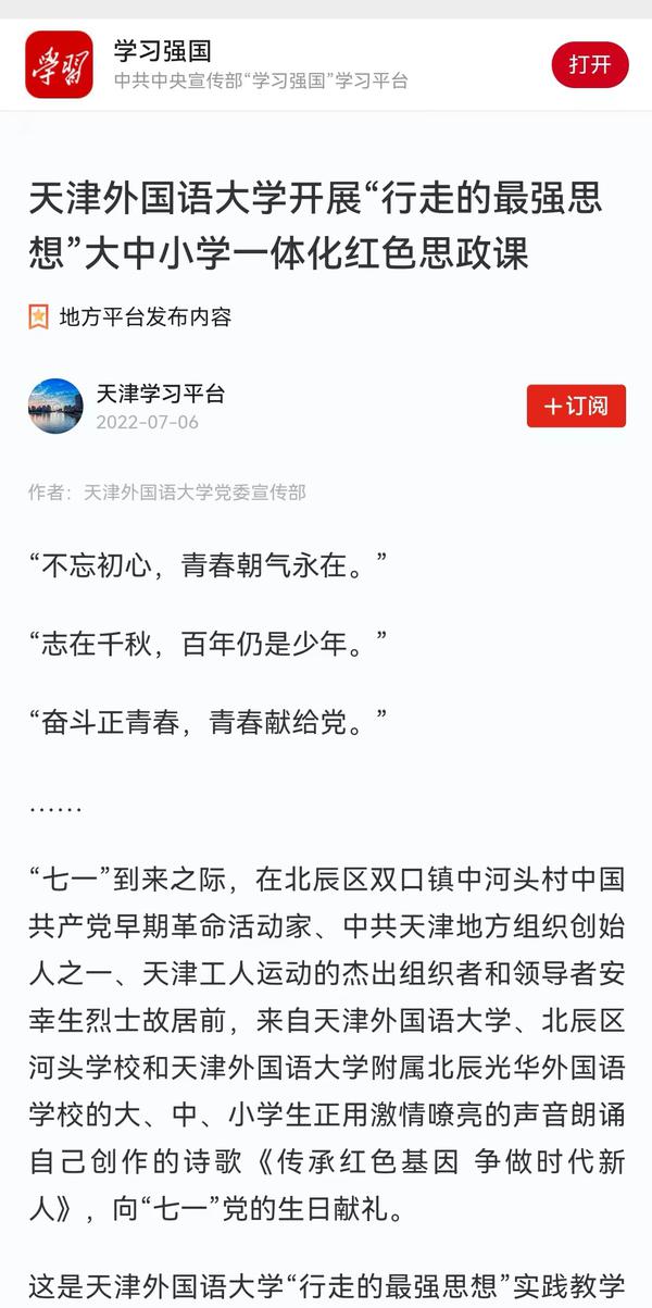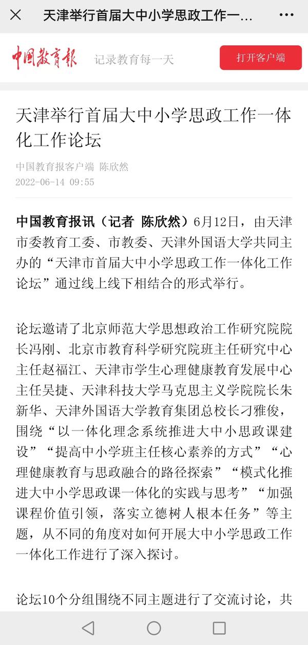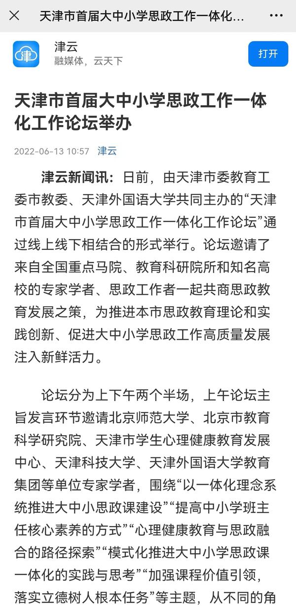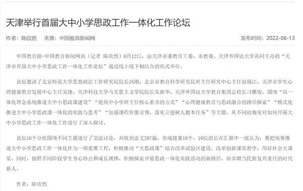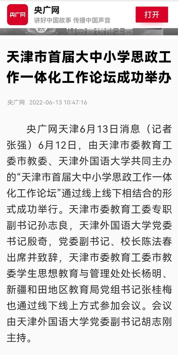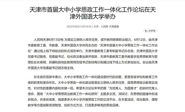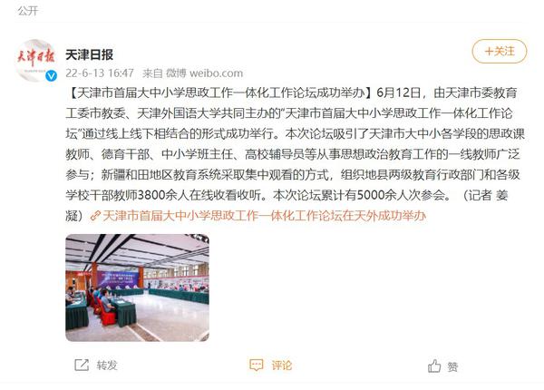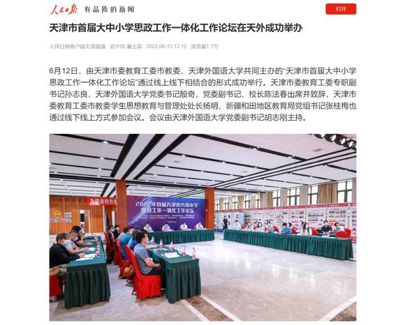 6月12日,由天津市委教育工委市教委、开云体育共同主办的“天津市首届大中小学思政工作一体化工作论坛”通过线上线下相结合的形式成功举行。论坛吸引了我市大中小各学段的思政课教师、德育干部、中小学班主任、高校辅导员等从事思想政治教育工作的一线教师广泛参与;新疆和田地区教育系统组织各级学校干部教师3800余人在线收看收听。人民日报客户端、人民网、央广网、中国教育新闻网、天津日报官方微博、津云、天津教育报、天津工人报、网易新闻等国家及地方媒体进行了报道。