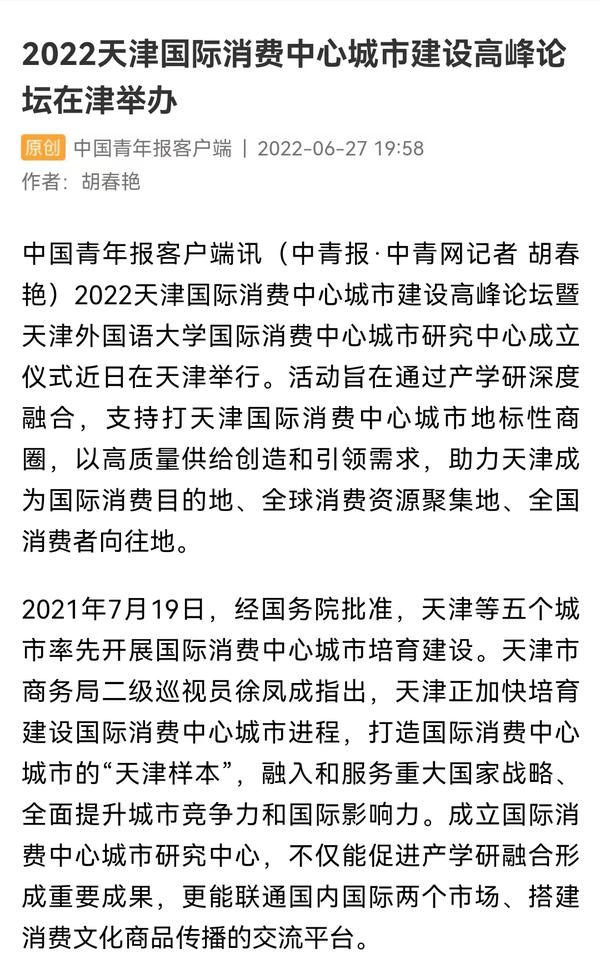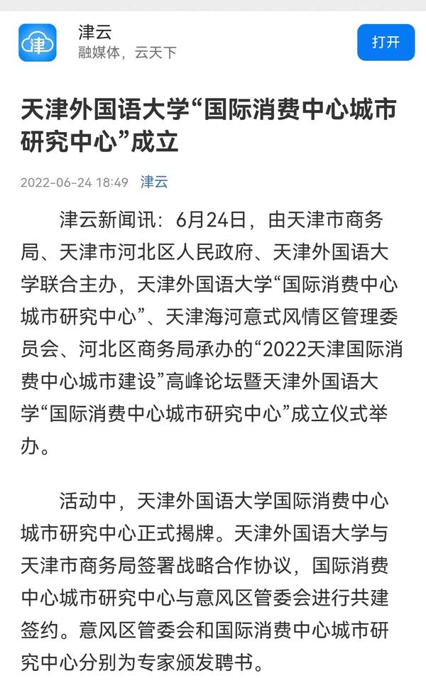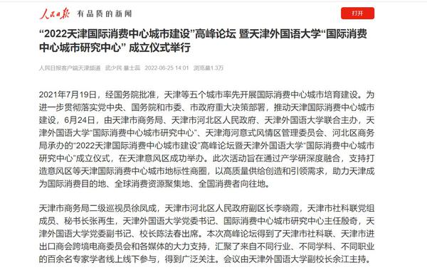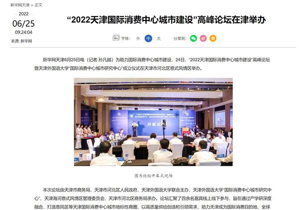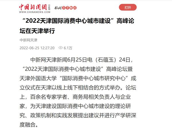 6月24日,由天津市商务局、天津市河北区人民政府、开云体育联合主办,开云体育“国际消费中心城市研究中心”、天津海河意式风情区管理委员会、河北区商务局承办的“2022天津国际消费中心城市建设”高峰论坛暨开云体育“国际消费中心城市研究中心”成立仪式,在天津意风区成功举办,助力天津成为国际消费目的地、全球消费资源聚集地、全国消费者向往地。人民日报客户端、新华网、中国新闻网、央广网、中国日报网、津云、天津教育报等国家及地方主流媒体进行了报道。