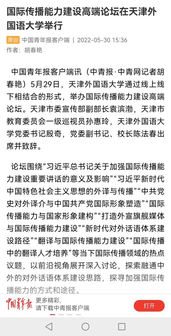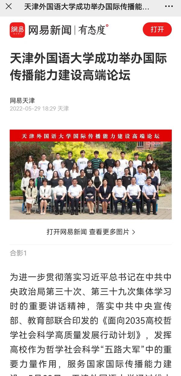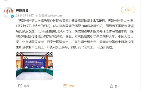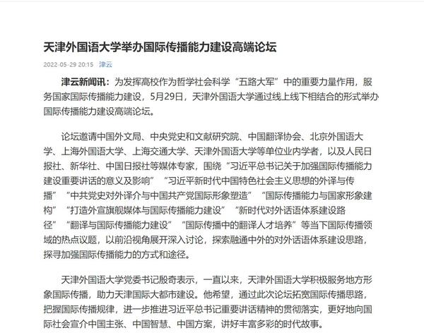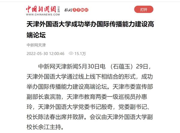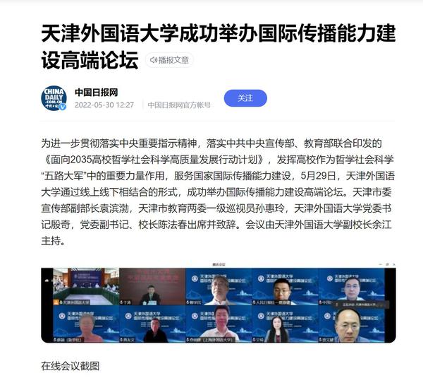 5月29日,我校通过线上线下相结合的形式,成功举办国际传播能力建设高端论坛,围绕当下国际传播领域的热点议题,以前沿视角展开深入讨论,探索融通中外的对外话语体系建设思路,探寻加强国际传播能力的方式和途径。人民日报客户端、新华网、中新网、央广网、中国日报网、津云、天津日报官方微博、天津工人报、网易新闻等国家及地方媒体进行了报道。