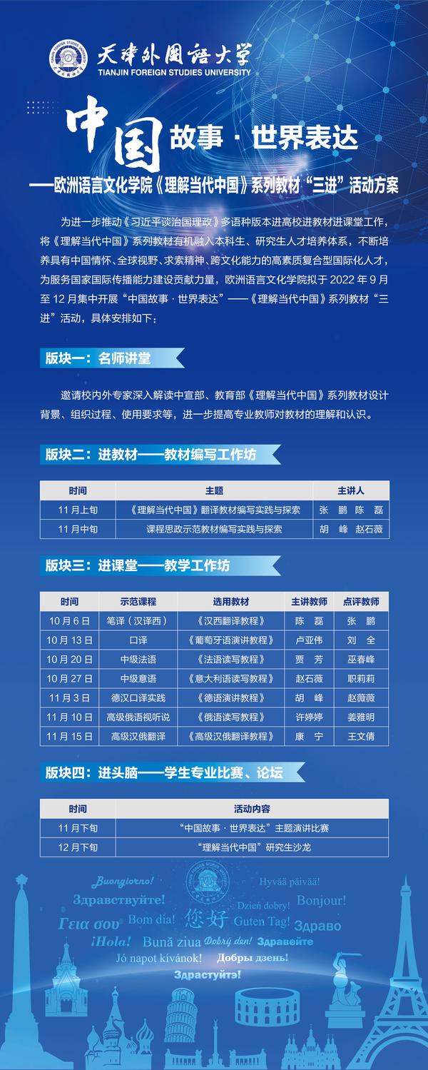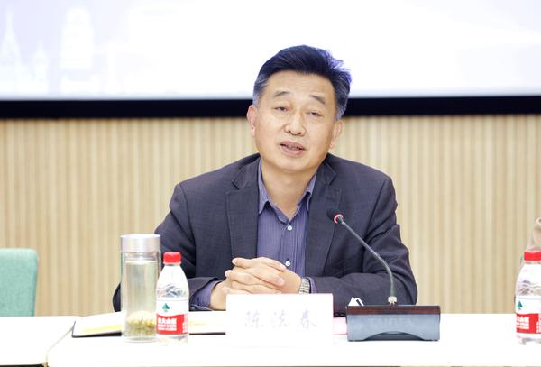 为进一步推动《习近平谈治国理政》多语种版本进高校进教材进课堂工作(以下简称“三进”工作),将《理解当代中国》系列教材有机融入本科生、研究生人才培养体系,为服务国家国际传播能力建设贡献力量,10月6日下午,欧洲语言文化学院在逸夫楼大江厅举办《理解当代中国》多语种教材“三进”系列活动部署会暨首场教学工作坊活动。校党委副书记、校长陈法春教授出席并作动员讲话,学院全体班子成员、系主任、学科带头人及各专业骨干教师等50余人通过线上线下方式参会。会议由学院党委书记安娜主持。
