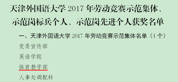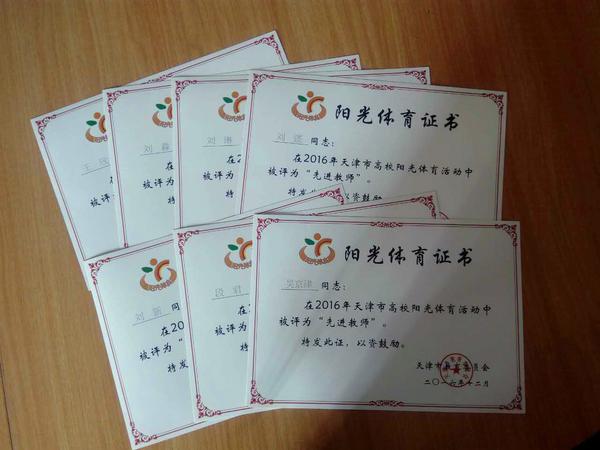 体育部教师教学能力强,技术水平高,在“天津市高校青年体育教师教学基本功大赛”中屡获佳绩,共获得一等奖1人、二等奖4人、三等奖4人;1人获“天津市高等学校体育课程教学”一等奖;10人获天津市教委“阳光体育先进教师”;2人次获校级“德业双馨教师”;2人次获“良师益友标兵”等荣誉称号。