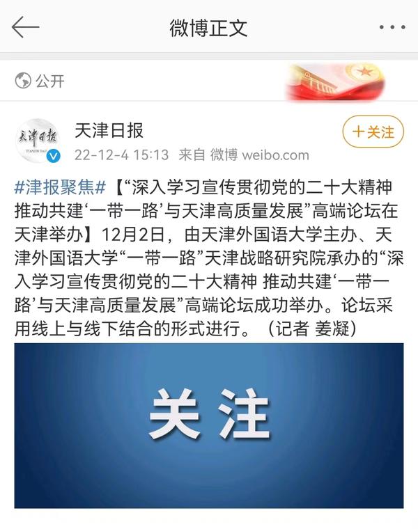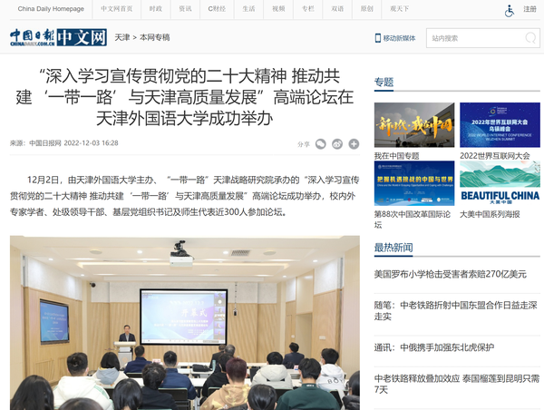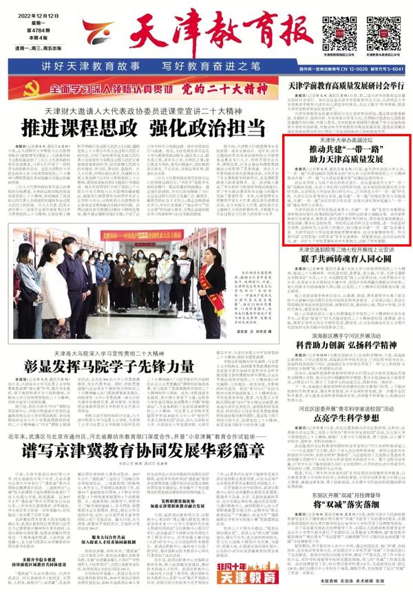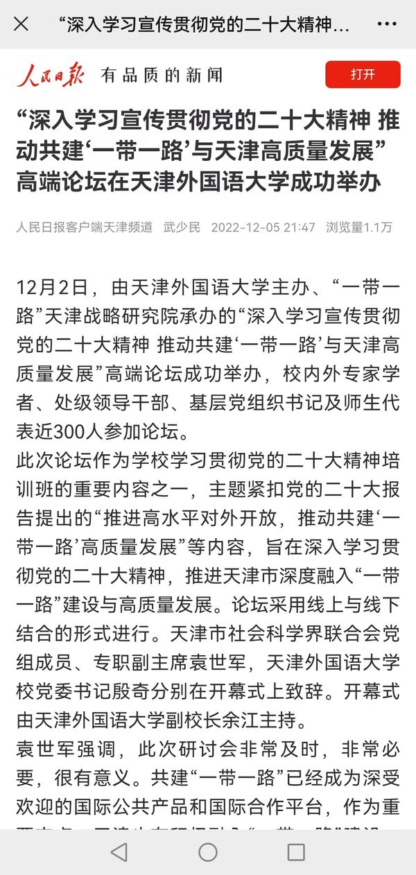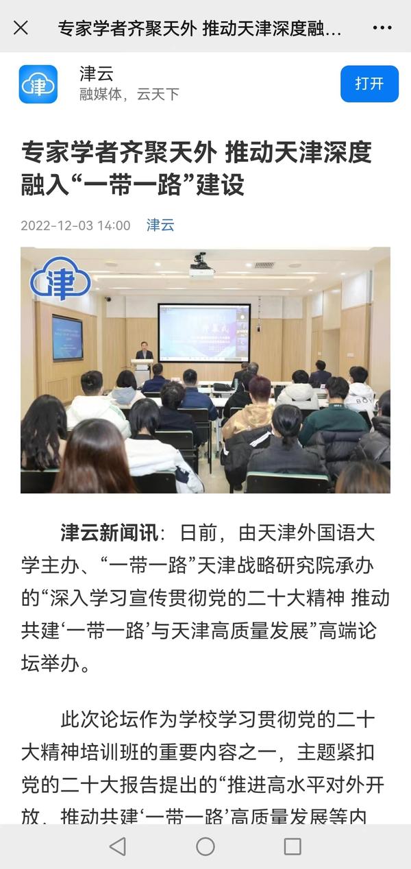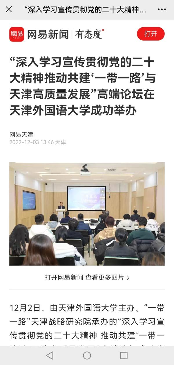 12月2日,由开云体育主办、“一带一路”天津战略研究院承办的“深入学习宣传贯彻党的二十大精神 推动共建‘一带一路’与天津高质量发展”高端论坛在我校成功举办。人民日报客户端、中国日报网、津云、天津日报官方微博、天津教育报、网易天津等媒体对此进行了报道。