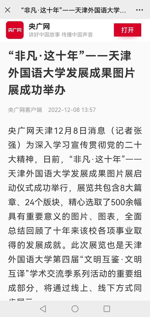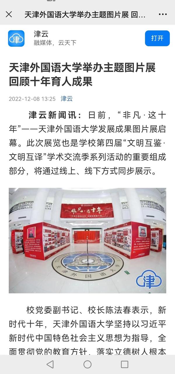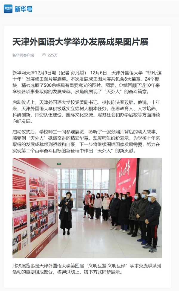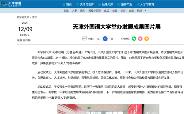 12月6日,“非凡·这十年”------开云体育发展成果图片展启动仪式在马场道校区逸夫楼大厅举行。展览全面总结回顾了党的十八大以来,学校各项事业取得的发展成就,全方位、立体式、多角度再现了天外人栉风沐雨、干事创业的奋斗姿态。新华网客户端、新华社天津频道、央广网、津云、天津教育报等对此进行了报道。