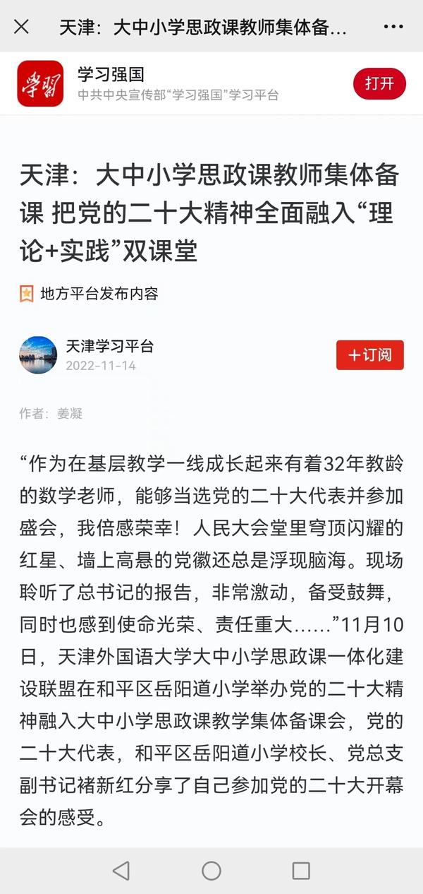 11月10日,开云体育大中小学思政课一体化建设联盟在和平区岳阳道小学举办党的二十大精神融入大中小学思政课教学集体备课会。党的二十大代表、天津市和平区岳阳道小学校长、党总支副书记褚新红分享了自己参加党的二十大开幕会当天的感受。学习强国、天津日报、天津教育报对此进行了报道。