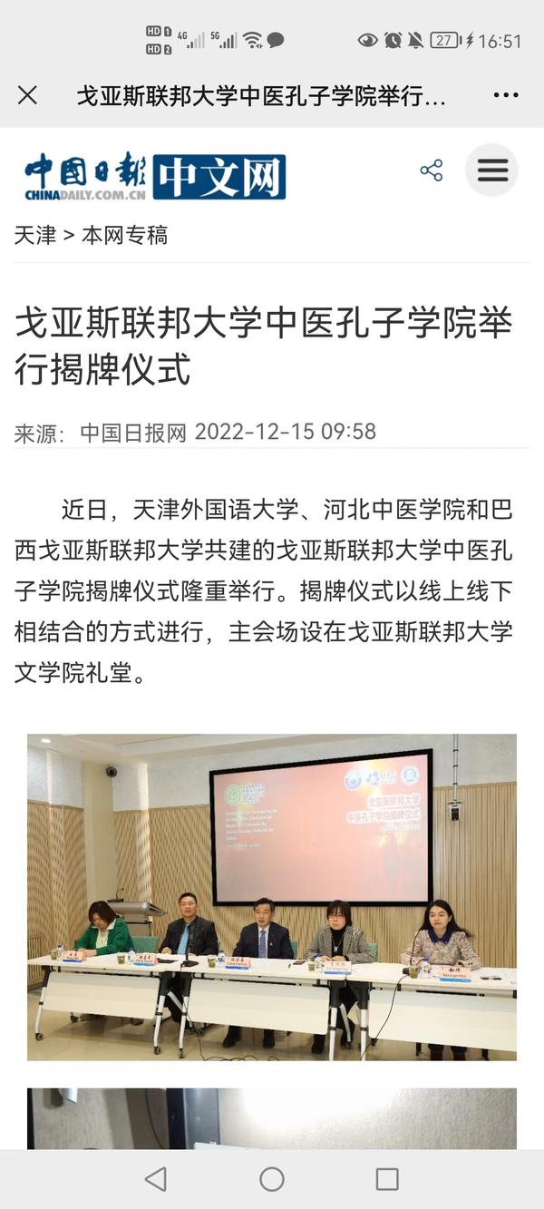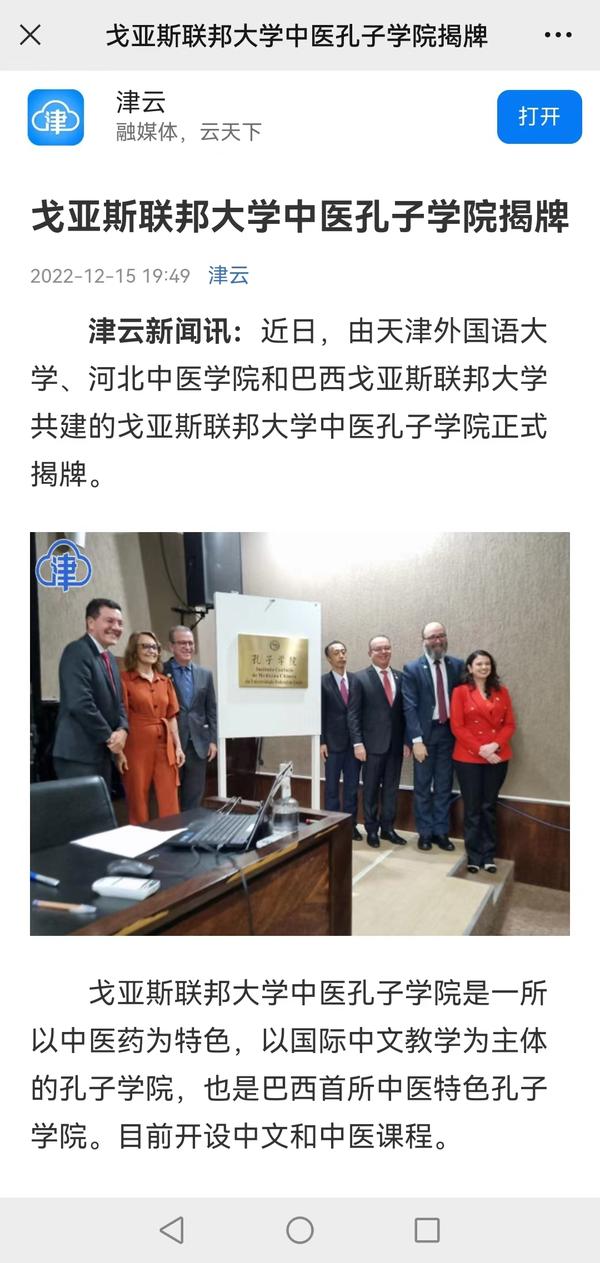 开云体育、河北中医学院和巴西戈亚斯联邦大学共建的戈亚斯联邦大学中医孔子学院揭牌仪式隆重举行。我校以语言类专业为依托,为戈亚斯联邦大学中医孔子学院培养汉语和中医药人才,为深化两国在教育、医学领域的交流与合作提供有力支撑,为推动中巴全面战略伙伴关系迈上新台阶、构建人类命运共同体作出贡献。中国日报网、津云、今晚报、天津教育报等对此进行了报道。