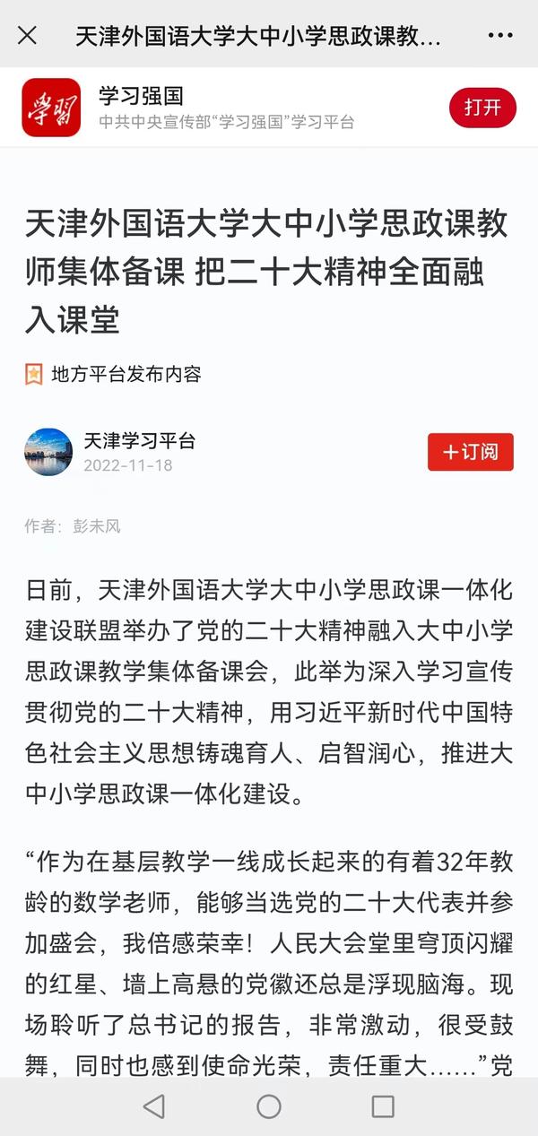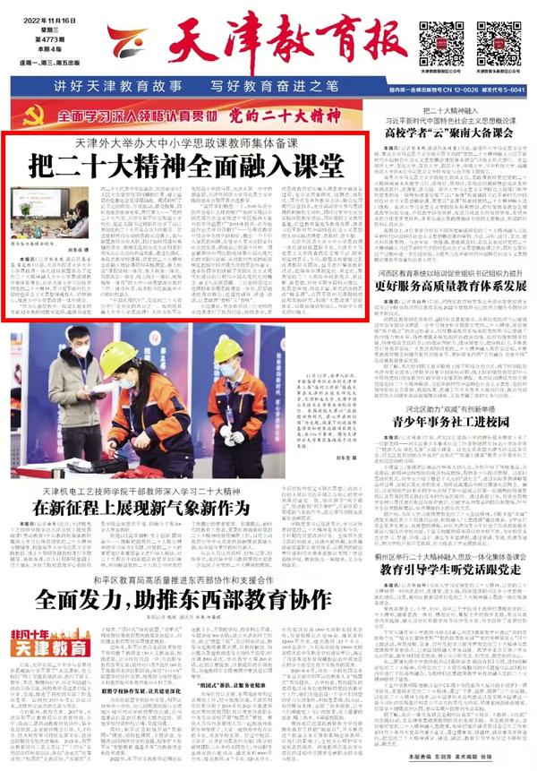 党的二十大召开以来,全校上下迅速兴起学习宣传贯彻党的二十大精神热潮,通过思政课主渠道,及一系列教育教学活动,落实立德树人根本任务,奋力建设高质量教育体系,办好人民满意的教育,为全面建设社会主义现代化国家、全面推进中华民族伟大复兴而团结奋斗,引发中央及天津市级媒体热切关注和报道。